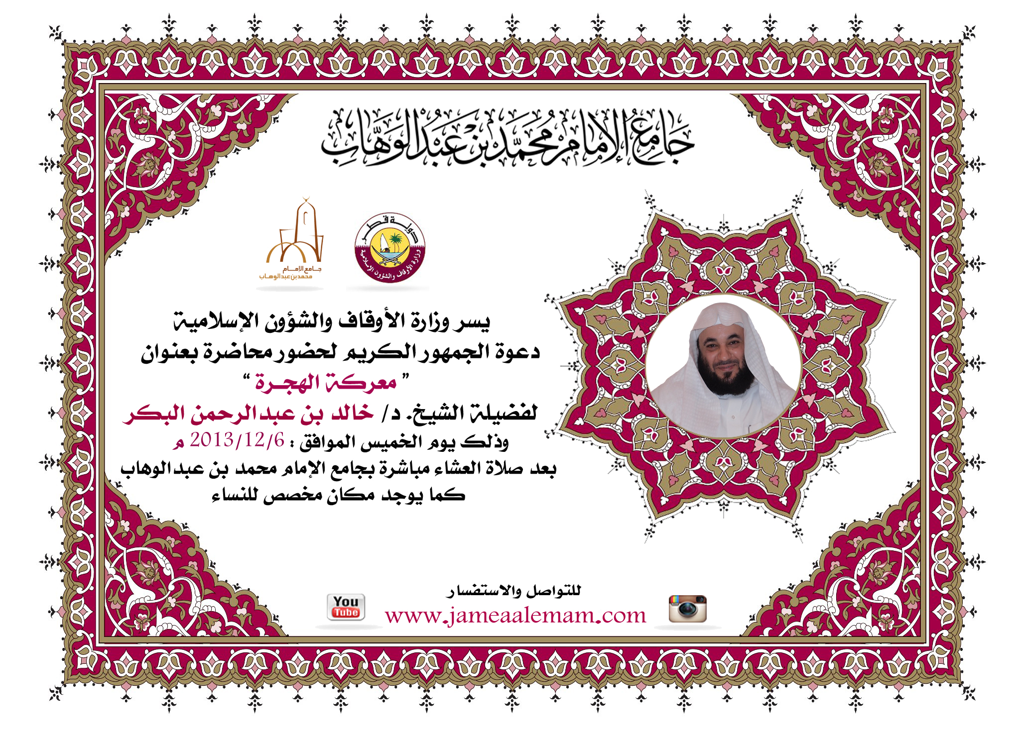 يسر وزارة الأوقاف والشؤون الإسلامية أن تعلن للجمهور الكريم بأنه توجد محاضرة دينية اليوم الخميس الموافق: 2013/12/5 م