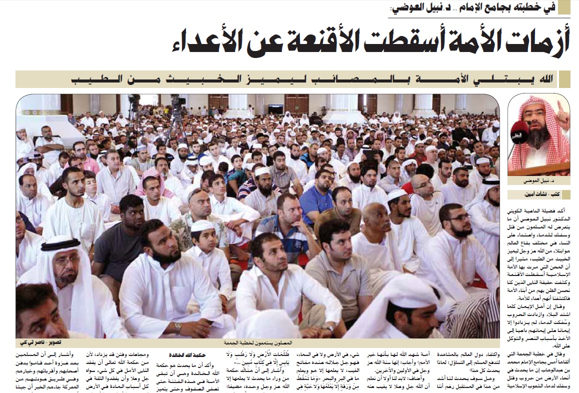 أكد فضيلة الداعية الكويتي الدكتور نبيل العوضي أن ما يتعرض له المسلمون من قتل وسفك للدماء واعتداء على النساء في مختلف بقاع العالم هو ابتلاء من الله عز وجل ليميز الخبيث من الطيب، مشيرا إلى أن المحن التي مرت بها الأمة الإسلامية أسقطت الأقنعة وكشفت حقيقة الناس الذين كنا نحسن الظن بهم من أبناء الأمة فاكتشفنا أنهم أعداء للأمة. وقال إن أهل الإيمان كلما اشتد البلاء وازدادت الحروب وسٌفكت الدماء لم يزدادوا إلا إيمانا على إيمانهم داعيا إلى الأخذ بأسباب النصر والتوكل على الله.