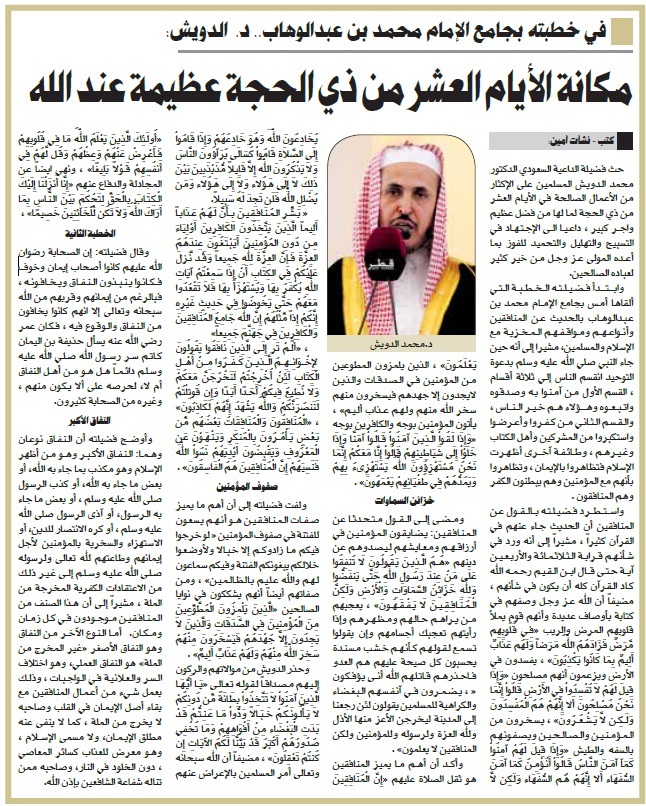 حث فضيلة الداعية السعودي الدكتور محمد الدويش المسلمين على الإكثار من الأعمال الصالحة في الأيام العشر من ذي الحجة لما لها من فضل عظيم واجر كبير ، داعيا الى الإجتهاد في التسبيح والتهليل والتحميد للفوز بما أعده المولى عز وجل من خير كثير لعباده الصالحين. وابتدأ فضيلته الخطبة التي ألقاها أمس بجامع الإمام محمد بن عبدالوهاب بالحديث عن المنافقين وأنواعهم ومواقفهم المخزية مع الإسلام والمسلمين، مشيرا إلى أنه حين جاء النبي صلي الله عليه وسلم بدعوة التوحيد انقسم الناس إلي ثلاثة أقسام ، القسم الأول من آمنوا به وصدقوه واتبعوه وهؤلاء هم خير الناس ، والقسم الثاني من كفروا وأعرضوا واستكبروا من المشركين وأهل الكتاب وغيرهم ، وطائفة آخرى أظهرت الإسلام فتظاهروا بالإيمان ، وتظاهروا بأنهم مع المؤمنين وهم يبطنون الكفر وهم المنافقون