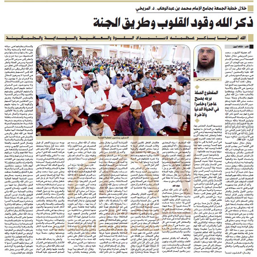 أكد فضيلة الشيخ د. محمد حسن المريخي خلال خطبة الجمعة أمس بجامع الإمام محمد بن عبد الوهاب أن خير ما يذكر به المسلمون بعد الحج هو ذكر الله تعالى بعد أن منّ الله علينا والمسلمين أجمعين في موسم الحج وعشر ذي الحجة بالعمل الصالح. وقال: كانت أمة العرب قبل الإسلام يجتمعون بعد الحج كما يزعمون في الأسواق والأندية ليتفاخروا بالآباء ويتعاظموا بالأنساب، فلما منّ الله تعالى عليهم بالإسلام وبعثة سيدنا محمد صلى الله عليه وسلم خير الأنام ارتفعت الهمم واستنار الفكر وسلك بهم مسالك العزة وسبل الكرامة فشرع لهم بعد الحج ذكر الله تعالى ومواصلة العبادة لله وتوثيق الصلة بالله سبحانه فَإِذَا قَضَيْتُمْ مَنَاسِكَكُمْ » فَاذْكُرُوا الّلهََ كَذِكْرِكُمْ آَبَاءَكُمْ أَوْ أَشَدَّ ذِكْرًا فَمِنَ النَّاسِ مَنْ يَقُولُ رَبَّنَا آَتِنَا فِي الدُّنْيَا وَمَا لَهُ سورة « فِي الْآَخِرَةِ مِنْ خَلَاقٍ. البقرة - الآية 200