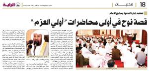 الدوحة - [ : تناولت المحاضرة اﻷولــــى مــن بــرنــامــج «أولــــي الــعــزم من الــــرســــل» الـــــذي تــنــظــمــه إدارة الـــدعـــوة واﻹرشـــاد الديني بجامع اﻹمـــام محمد بــن عــبــد الــوهــاب وألــقــاهــا الــشــيــخ سعيد بن مسفر القحطاني، حياة رســول اﷲ نــوح عليه الــســﻼم، حــيــث تــحــدث الشيخ عن بداية الخلق، وتوحيد اﷲ وتعمير الــبــشــريــة لـــــﻸرض، والـــشـــرك وصــــوره، واﻷنـــبـــيـــاء والــمــرســلــيــن لـــهـــدايـــة الــنــاس إلــى اﻹيــمــان بــاﷲ وعبادته دون غيره، وإرسال الخالق لنوح عليه السﻼم لدعوة الناس إلى ترك عبادة اﻷصنام وعبادة اﷲ الواحد اﻷحد، وكيف صبر نوح عليه السﻼم على قومه أكثر من 900 عام.