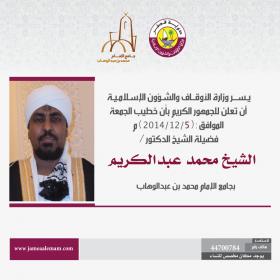 يسر وزارة الأوقاف والشؤون الإسلامية أن تعلن للجمهور الكريم بأن خطيب الجمعة لهذا الأسبوع الموافق :
