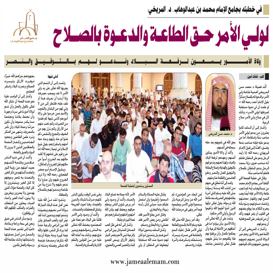 أكـــد فضيلة د. محمد حسن الـــمـــريـــخـــي أهـــمـــيـــة طـــاعـــة ولـــيً اﻷمر، والدعوة له بالصﻼح مذكرا بقول اﻹمام أحمد رحمه اﷲ :» لو علمت أن لي دعــوة مستجابة لصرفتها لــولــي اﻷمـــــر»، وذلــك ﻷن في صــﻼح ولــي اﻷمــر صﻼح الرعية.